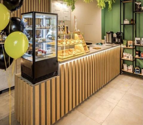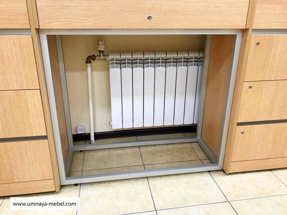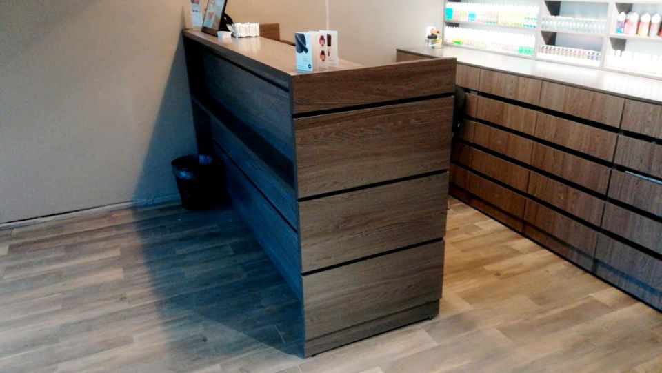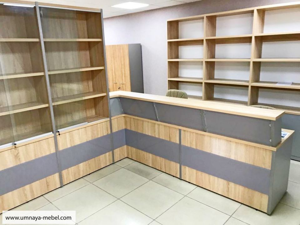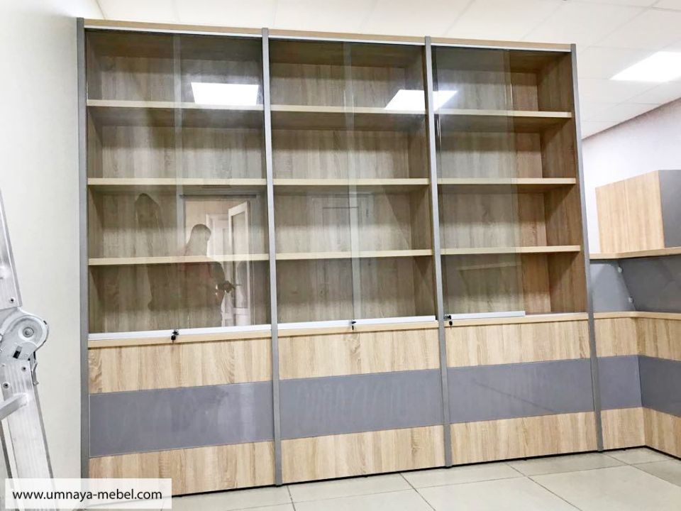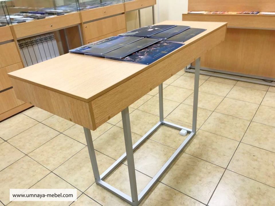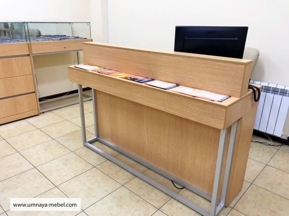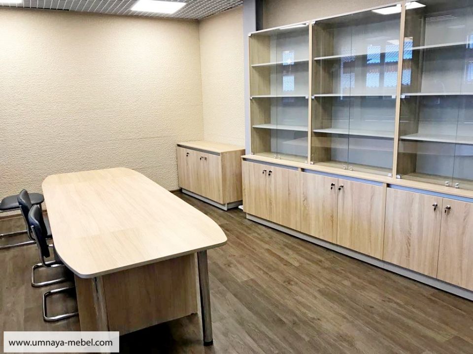 Материалы: ЛДСП Бук Кантри Egger; Стекло 6 мм; Металлические подстолья на регулируемых опорах;