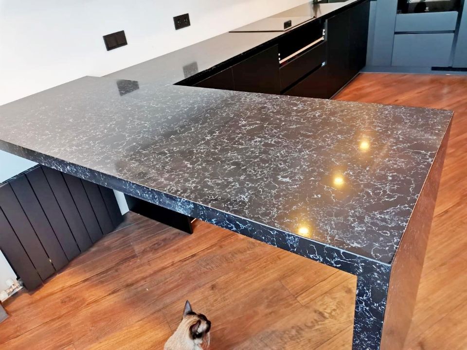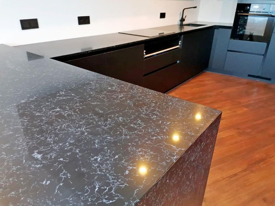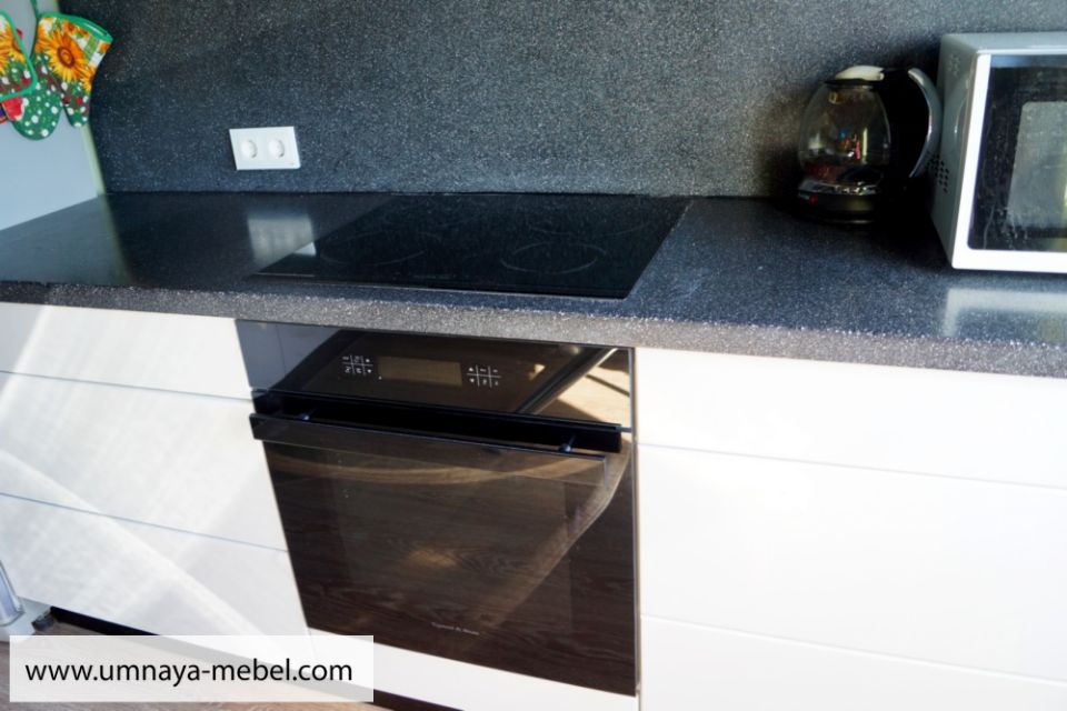 Столешница: Кварцевый агломерат 2-х видов, Стеновая панель в цвет основной столешницы.