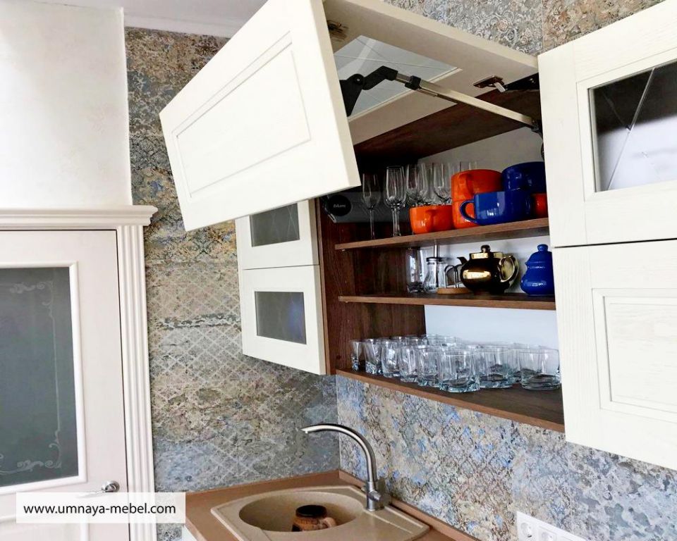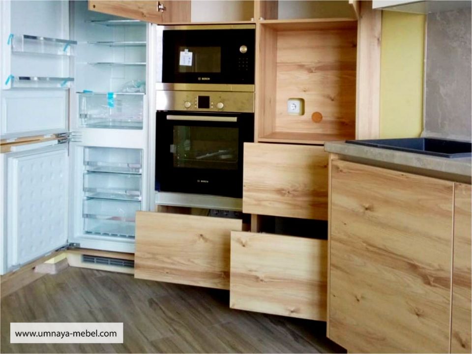 Большой выбор умной фурнитуры: Бесшумные, с доводчиками, ящики с системой «без ручек». Бутылочницы, сушки для посуды, системы хранения, лотки для столовых приборов, сетки, корзины, встроенные мусорные ведра и прочие.