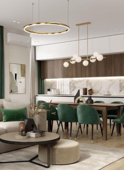Просторная кухня в доме, барная стойка и обеденная зона: