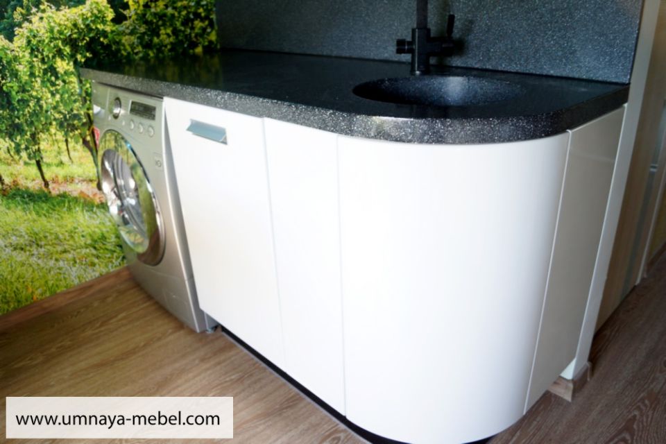 Фурнитура: Blum. Радиусные фасады, интегрированная мойка из кварцевого агломерата.