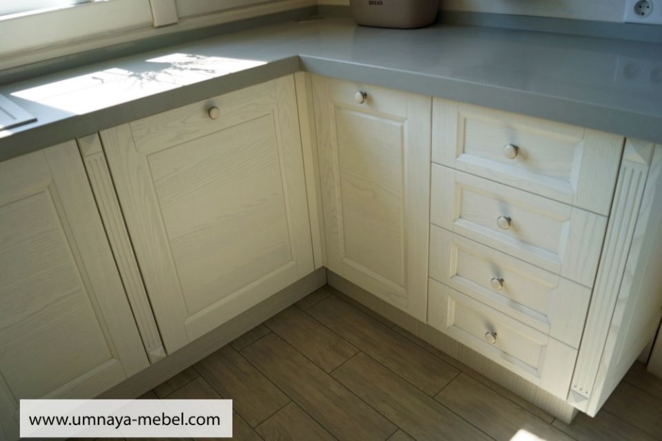 Столешница: Hi-Macs S005 grey. Материал ЛДСП: Egger: корпуса- Древесина белая;