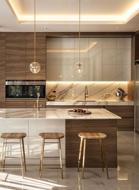 Столешница: Кварцевый агломерат "Калакатта" MX1100, Стеновая панель: Кварцевый агломерат "Калакатта" MX1100, Остров: Кварцевый агломерат "Калакатта" MX1100.